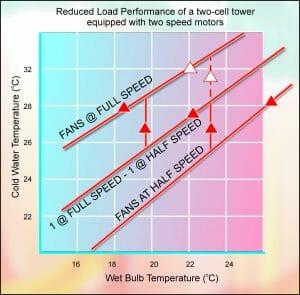 Fan control is, without doubt, extremely beneficial in varying the thermal performance level of a cooling tower when applied properly. However, misapplication can also have a detrimental effect upon the ultimate energy costs of some air conditioning systems. An induced draught crossflow cooling tower can achieve 10 – 15% performance at zero fan speed due to natural air movement, while the enclosed nature of a forced draught tower prevents this advantage.