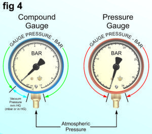 A conventional Pressure Gaugereads the positive pressure of a gas or liquid above Atmospheric Pressure. A Compound Gaugeis able to indicate both positive pressure and the negative pressure created by Vacuum Pressure.