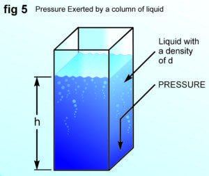 The pressure exerted by a column of liquid due to gravitational force is dependant upon the Densityof the liquid and the Heightof the column: