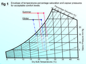The objective of all comfort air conditioning installations and systems is to ensure the comfort of individuals in the conditioned zone and this is achieved by control of temperature and percentage saturation levels within prescribed limits. Following studies by ANSI & ASHRAE, * which measured the effects of temperature, humidity (percentage saturation), air motion and clothing on human comfort, the ANSI/ASHRAE Standard 55-1981 was developed. The results are very extensive but for our general purposes, the ideal comfort envelope is as defined in Figure 1.
