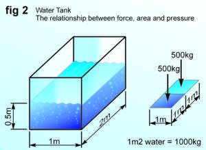 Figure 2 shows a tank containing 1 m3of water weighing 1000 kg. The downward force due to gravity is equal to 9.81 N/kg. The total force exerted on the base of the tank is therefore 9810 N.