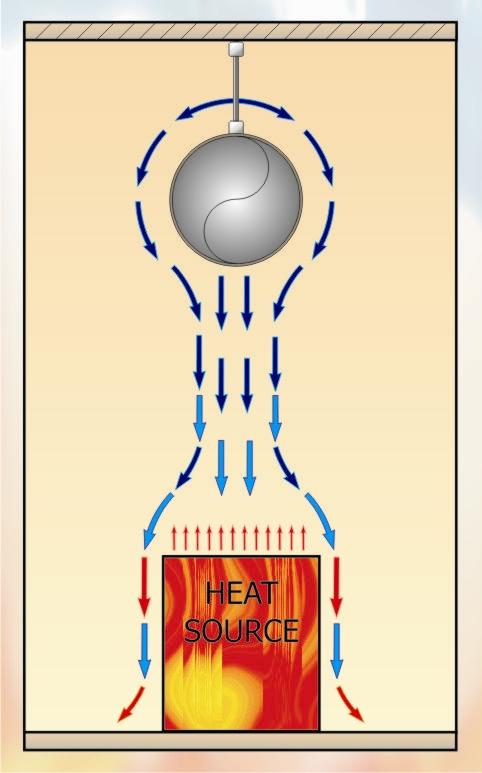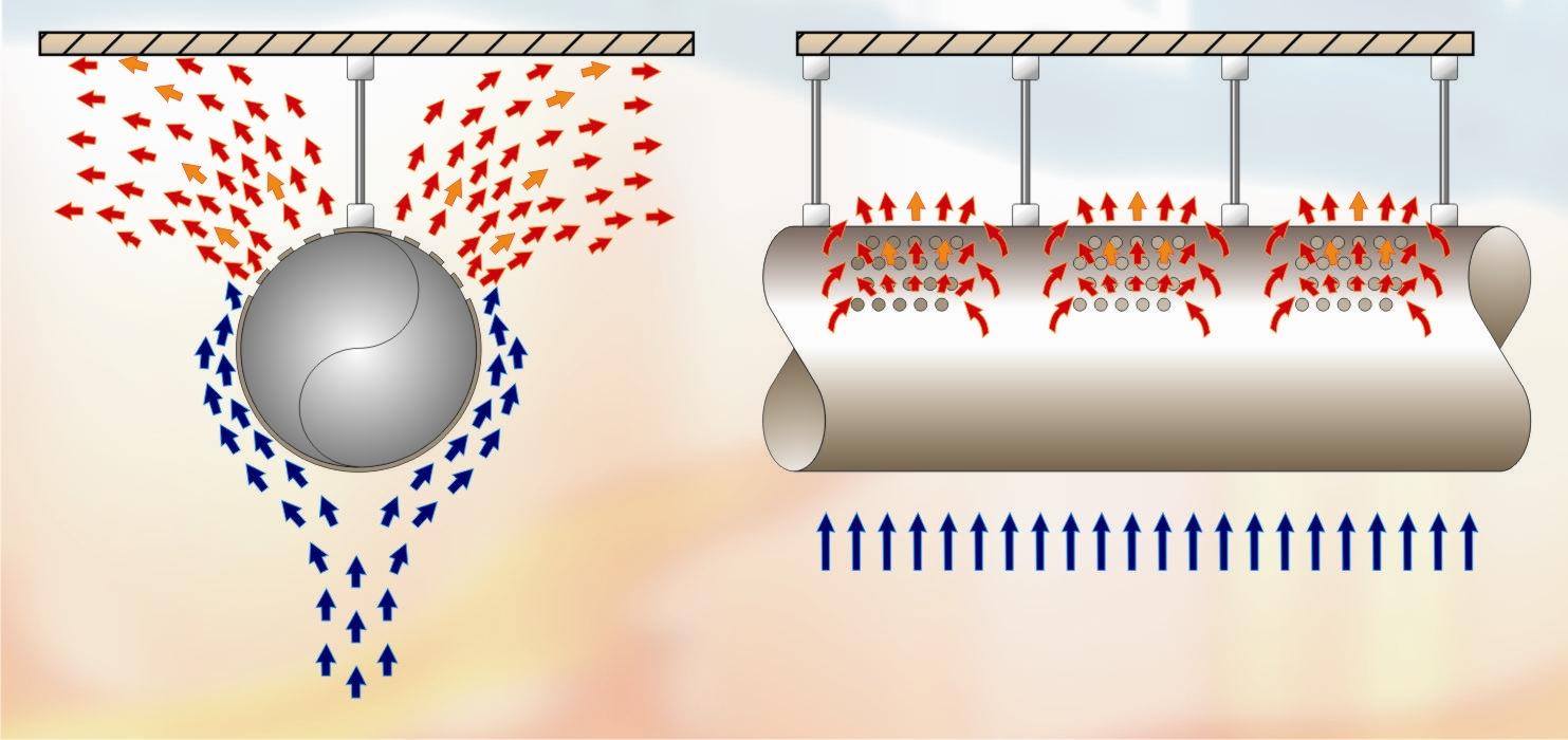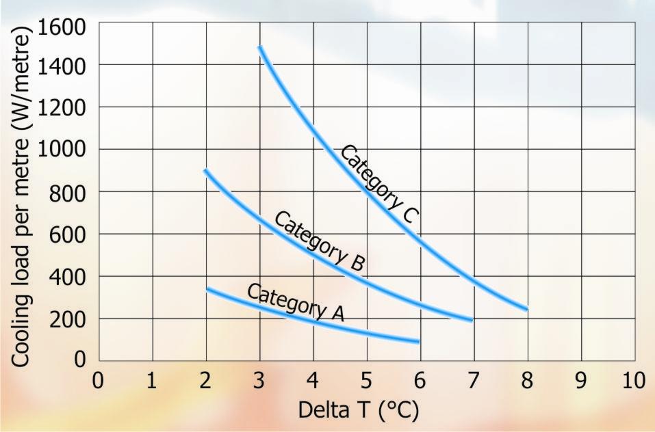Figure 3 shows what can happen if the heat source is of a considerable size and the result of which is that the falling cooling air currents ‘ricochet’ off the rising heat convection currents. This can cause draught as all the cooling air falls to one side of the heat source. The way in which this can be over come, is to have the low impulse ducts to one side of the heat source and in this way the cooling air then displaces the warm air. This equates to an efficient set up whereby 1 kW of cooling may overcome 1.5 kW of heat load.