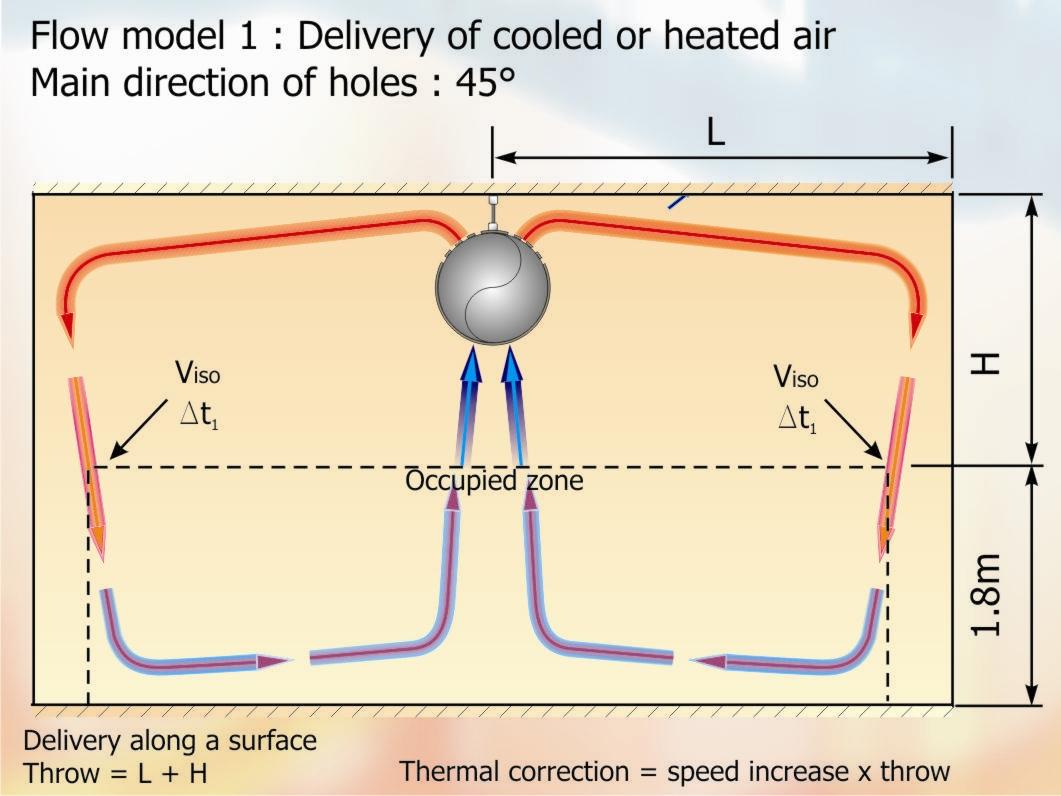 The supply air jets out of the specific pattern of holes at between 10 m/sec and 15 m/sec depending on design parameters and without noise irritation. The system has the ability to draw in 20 to 40 units of room air relative to 1 unit of supply air, this rated at a distance of 3,000 mm away from the duct. To provide a comparison, a traditional nozzle draws in 12 – 15 units of room air relative to 1 unit of supply air.