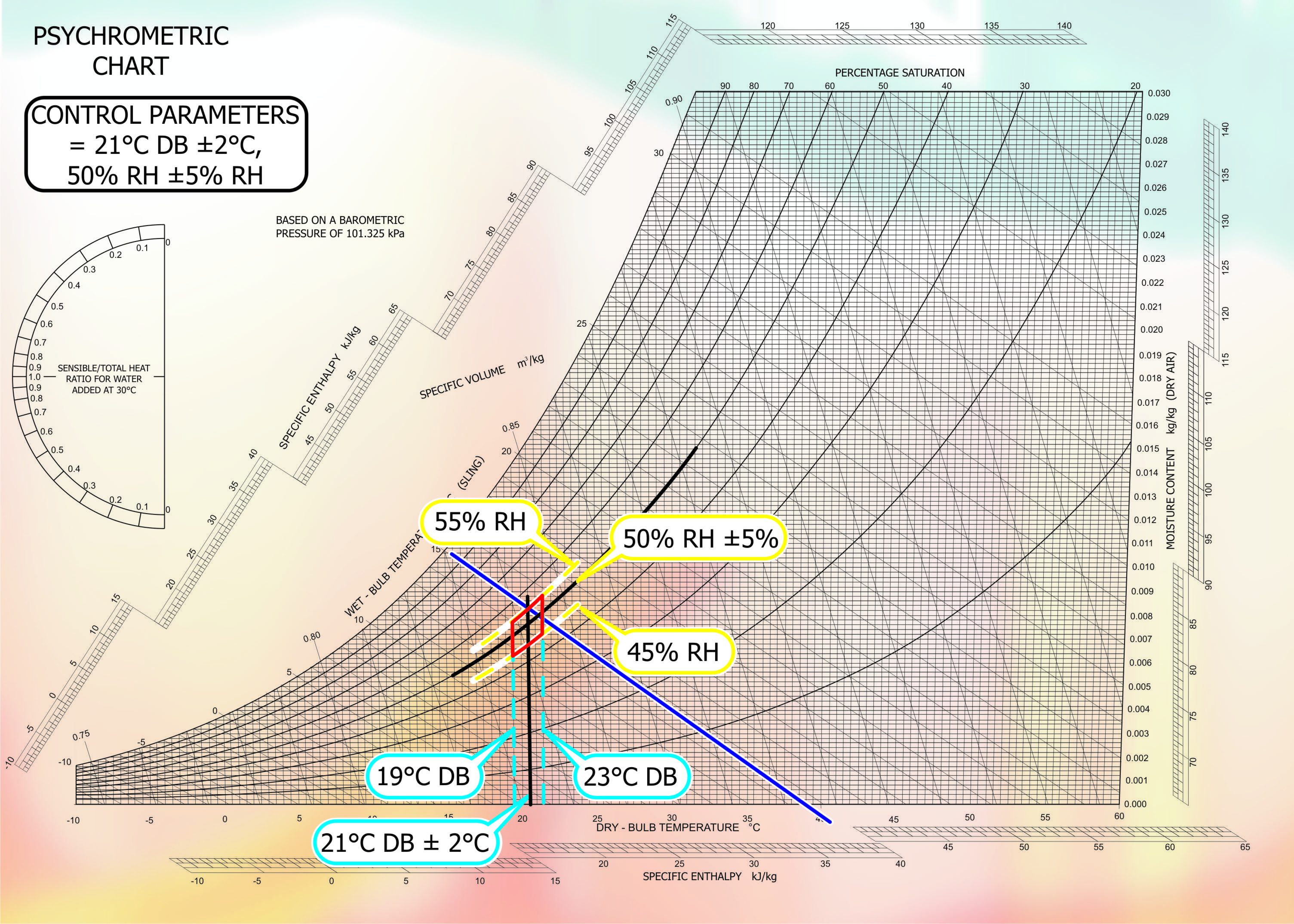 The statement that occurs time and again is that temperature and moisture content, whether in absolute or relative terms, are linked and cannot be seperated. We can sum this statement up with another rule of thumb: A temperature difference of 1.5oC affects a target humidity of 50% by about 5% RH. So when we specify 21°C DB +/- 2 degrees C and 50% RH +/- 5% Relative Humidity we are defining quite a considerable area of control as indicated on the Control Parameter Psychrometric Chart. We have not taken into account any accuaracy deviations that will occure with whatever type of control sensor we choose.