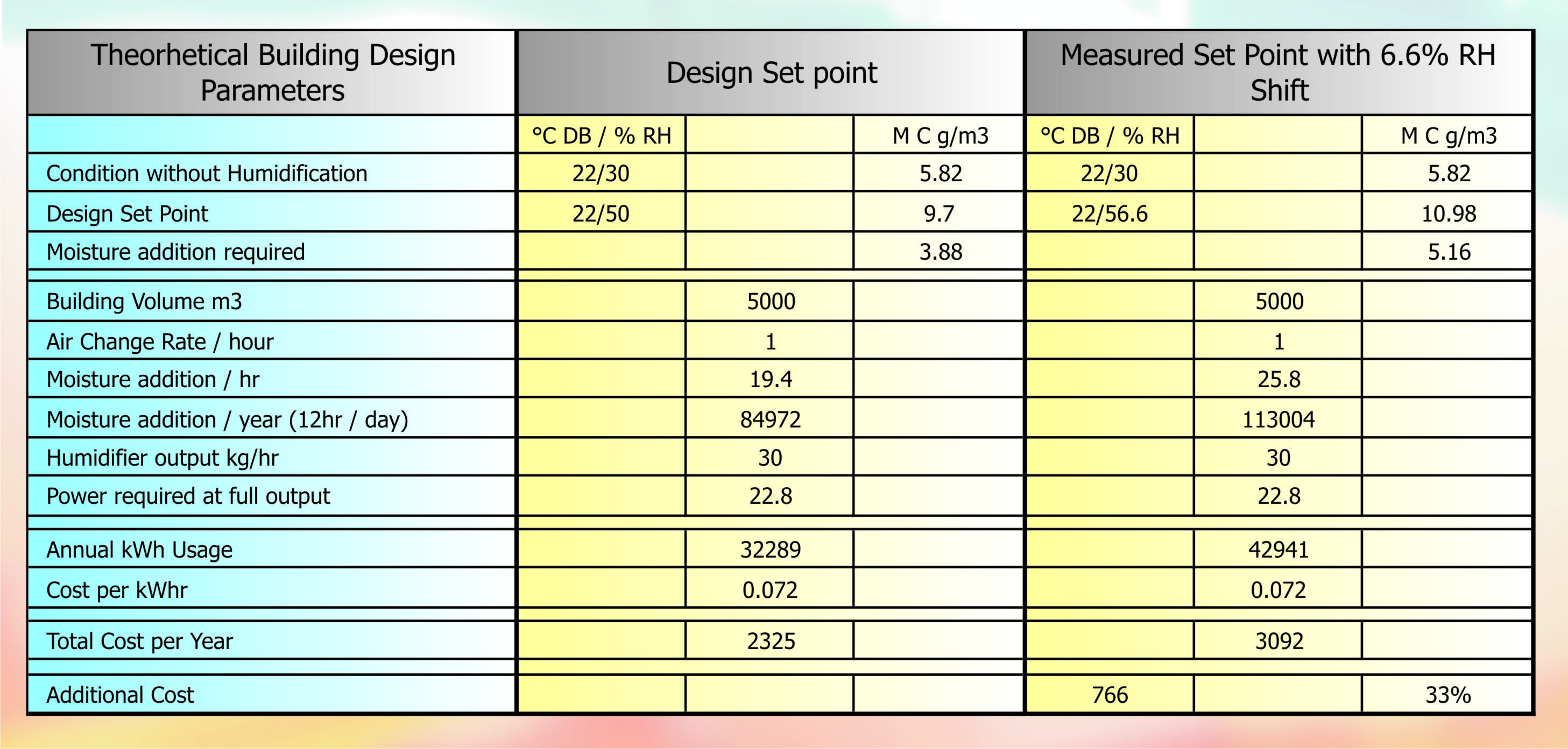 If we take this theoretical control shift or sensing error and equate it to a theoretical build of say 5000 m3 with a design set point of 22oC DB / 50% RH. If we apply our 6.6% shift so the measured set point is 22oC DB / 56.6% RH there is a possible 33% increase on run cost for an electrode boiler humidifier. One must off set the possibility the shift is in the other direction and the measured set point is 22oC DB / 43.4% RH, in which case there would be a 33% reduction in cost. It’s all down to whether the sensors are measuring predominantly high or low.