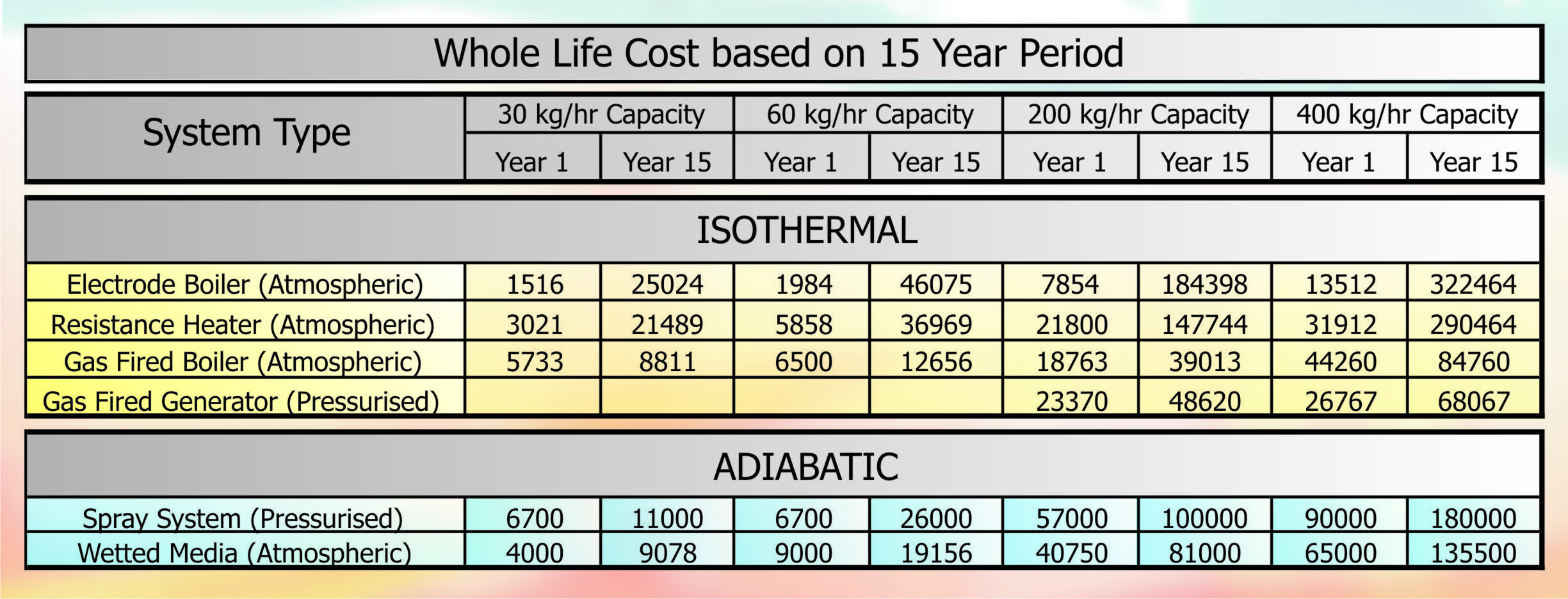 This final section covers comparative running costs over the 15-year life span one should expect from capital plant and looks at four different capacities. The comparison of systems within the Isothermal family include electrode and element boilers, local and centrally generated steam from gas fired equipment units compared are electrode boilers, element boilers, central steam generators. The wetted media and spray systems represent adiabatic family.